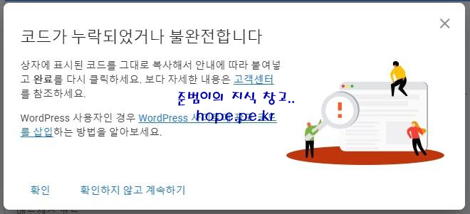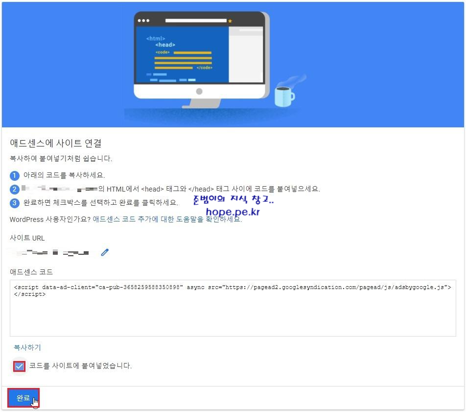 애드센스 화면으로 이동 후 '코드를 사이트에 붙여넣었습니다.' 에 체크 후 '완료' 를 클릭 합니다.