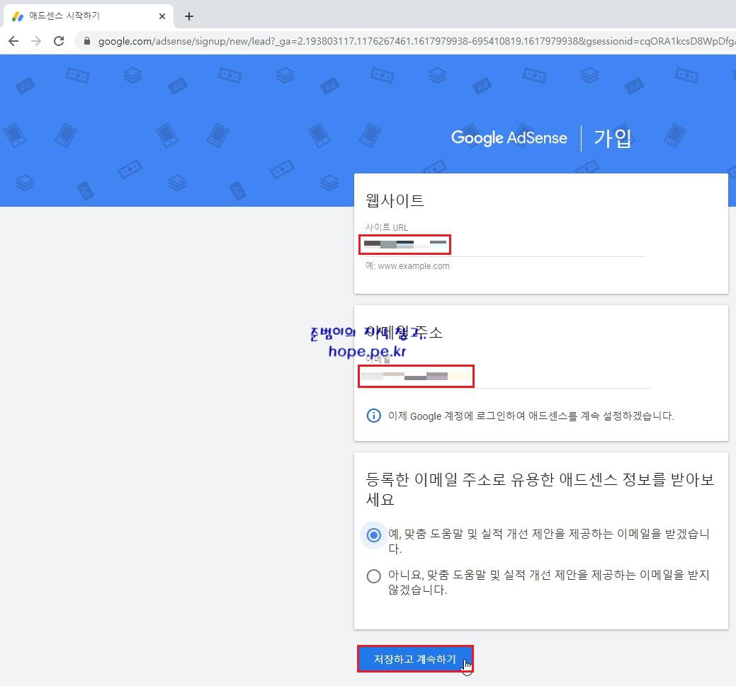 Google AdSense | 가입 화면에서, '웹사이트 URL' 및 '이메일 주소' 입력 후 '저장하고 계속하기' 를 클릭 합니다.