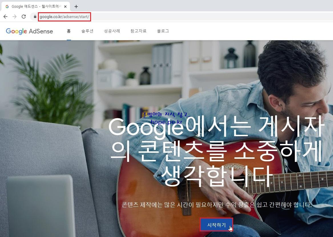 구글 애드센스 사이트 (https://www.google.co.kr/adsense/start) 에 접속 후 '시작하기' 를 클릭 합니다.