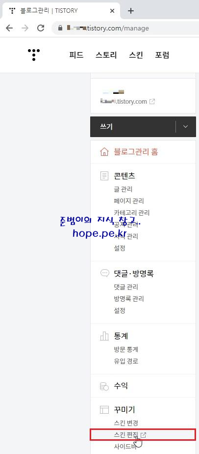 블로그 관리 홈 (https://OOOOO.tistory.com/manage) 으로 이동 후 '꾸미기 > 스킨편집' 을 클릭 합니다.