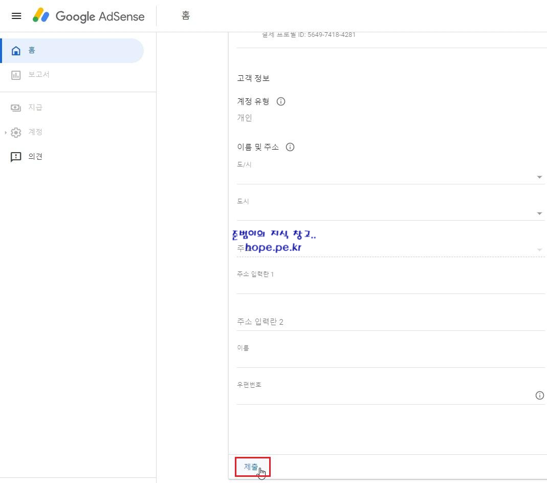 각 항목 입력 후 '제출' 을 클릭 합니다.