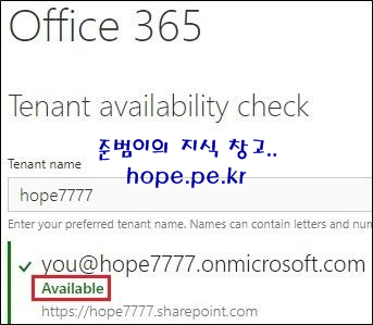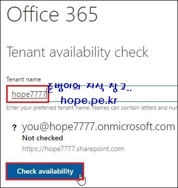 Tenant name 상자에 '원하는 테넌트명' 입력 후 'Check availability' 를 클릭 합니다. 저는 'hope7777' 테넌트명을 입력 했습니다.
