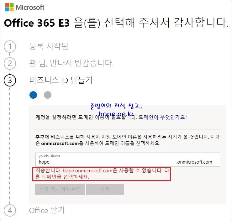 그동안 테넌트 이름을 선정하기 위해서는 Office 365 평가판 가입 사이트에서 핸드폰으로 확인 코드를 받아 인증 후 테넌트 이름을 입력하고 사용 가능 여부를 확인할 수 있었습니다.