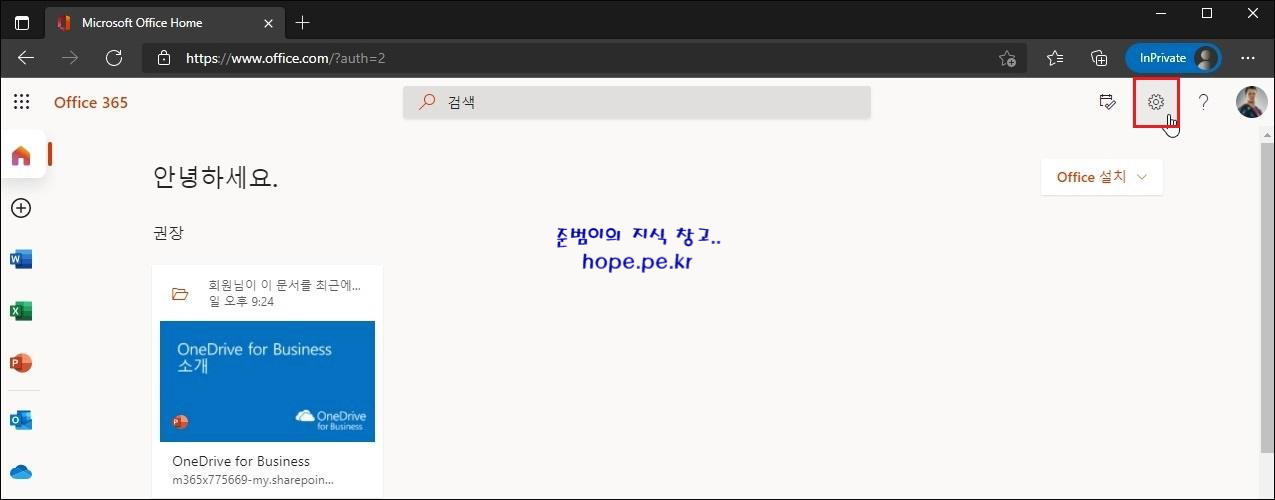 Office.com 사이트에 로그인 후, 우측 상단의 톱니바퀴 모양의 '설정' 버튼을 클릭 합니다.