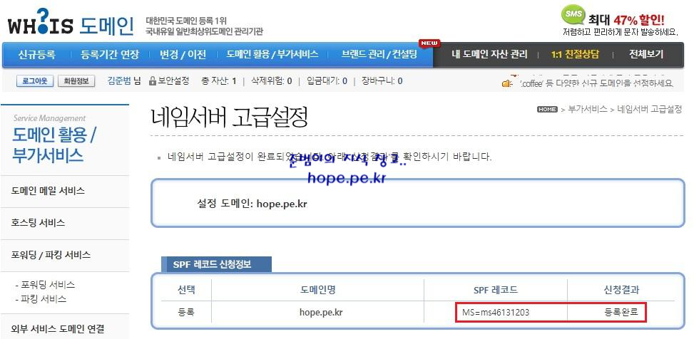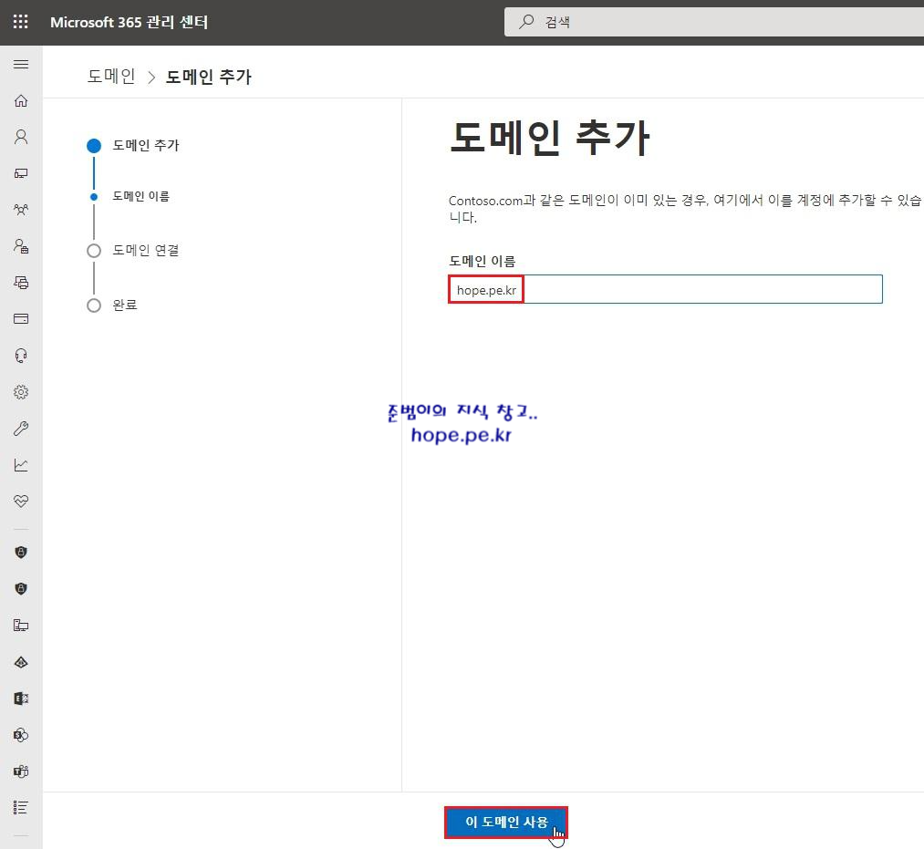 도메인 추가 화면에서, 'hope.pe.kr'도메인 이름 입력 후 '이 도메인 사용' 을 클릭 합니다.