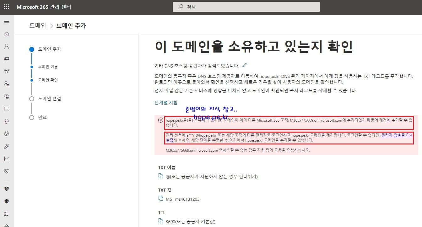 아래 화면과 같이, 'hope.pe.kr 도메인을 소유하거 있지만, 이미 다른 테넌트 M365x775669.onmicrosoft.com에 추가되었기 때문에 계정에 추가할 수 없습니다.' 라는 에러 메세지가 발생 합니다.