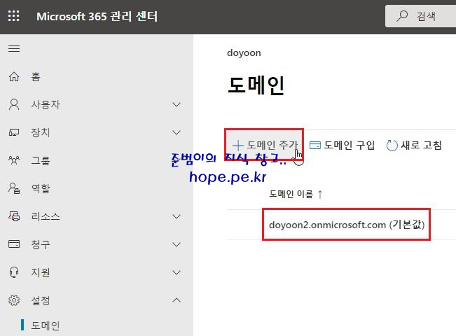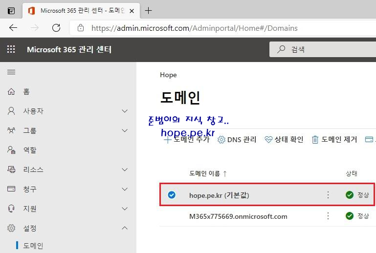 'M365x775669.onmicrosoft.com' 테넌트에 'hope.pe.kr' 도메인이 추가 완료된 상태 입니다.