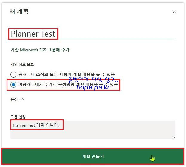 새 계획 화면에서, '계획 이름' 입력 - '개인 정보 보호' 선택 - '그룹 설명' 입력 - '계획 만들기' 를 클릭 합니다.