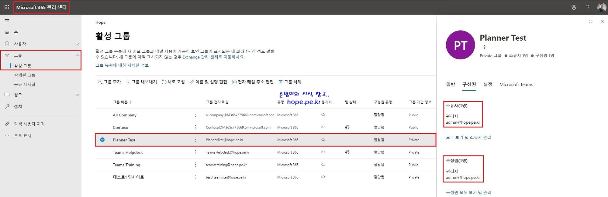 'Microsoft 365 관리 센터 - 그룹 - 활성 그룹' 에서는 방금 생성한 새 계획 이름이 그룹 이름으로 생성 되었고, 소유자 및 구성원에 새 계획을 생성한 사용자가 포함되어 있음을 확인할 수 있습니다.
