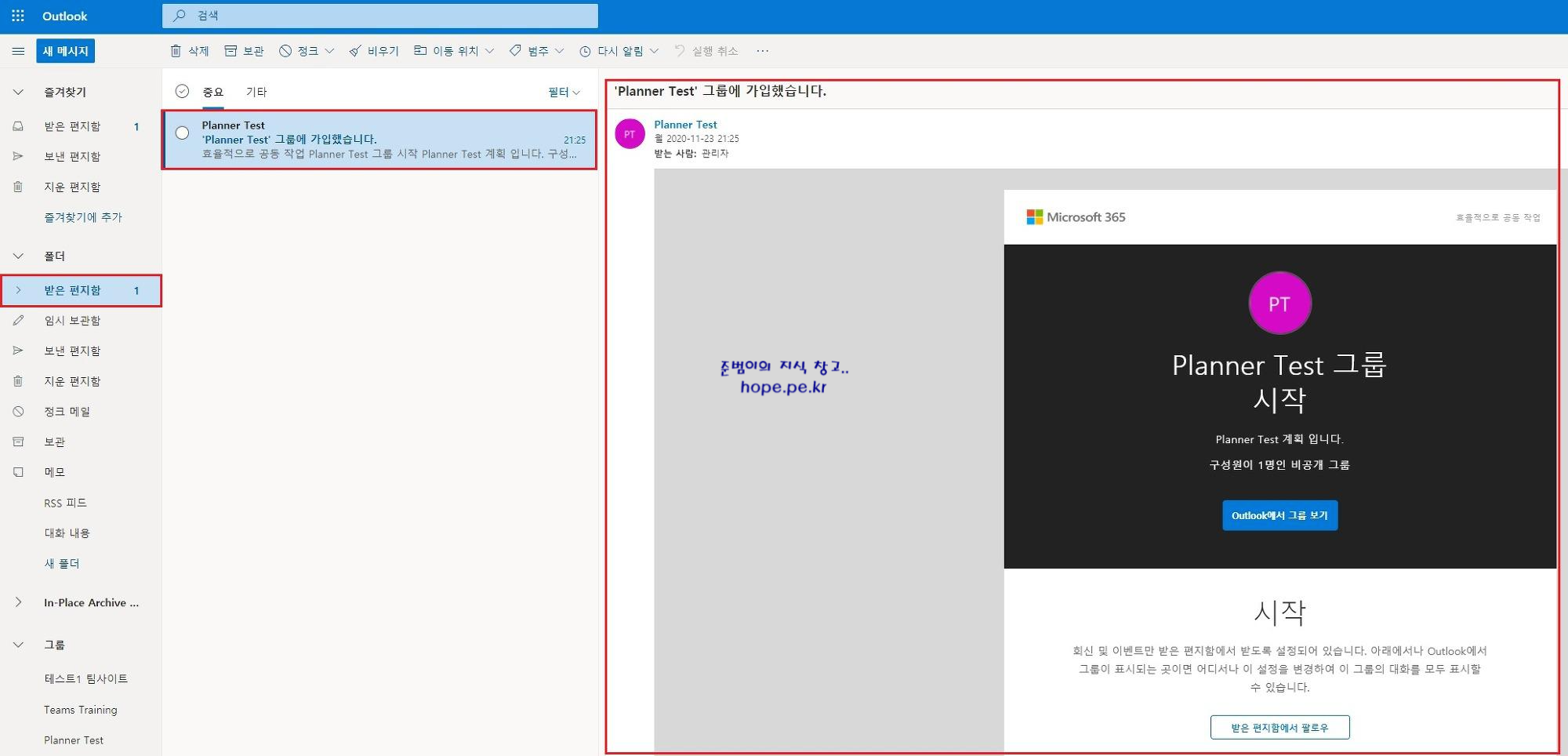 Outlook에서는 방금 Planner에서 만든 계획 이름으로 그룹 사서함이 생성이 되며, 그룹이 준비되었다는 내용의 메일을 수신 하게 됩니다.
