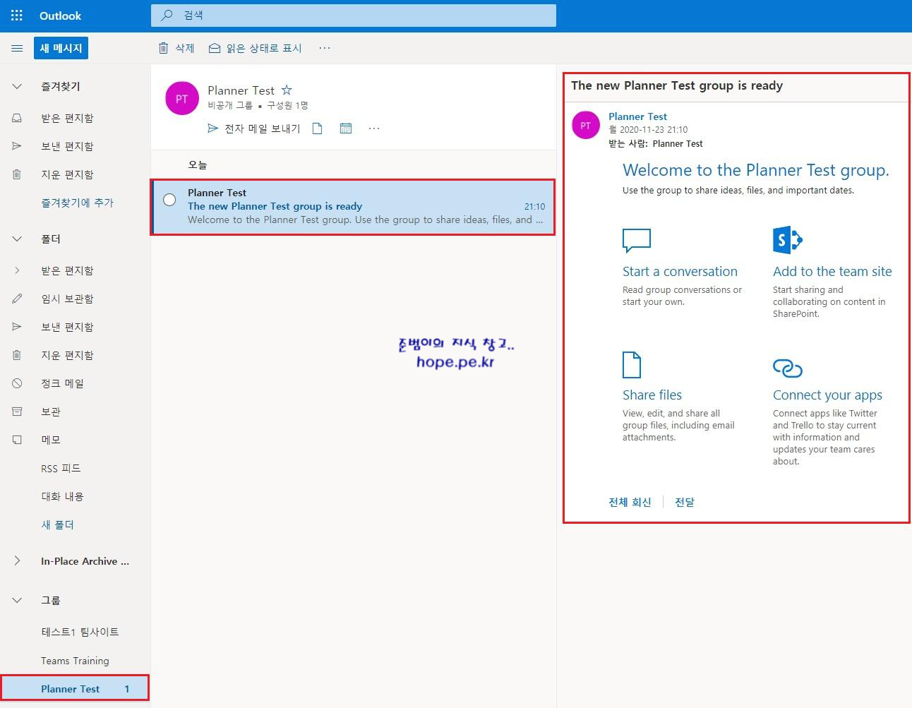 Outlook에서는 방금 Planner에서 만든 계획 이름으로 그룹 사서함이 생성이 되며, 그룹이 준비되었다는 내용의 메일을 수신 하게 됩니다.