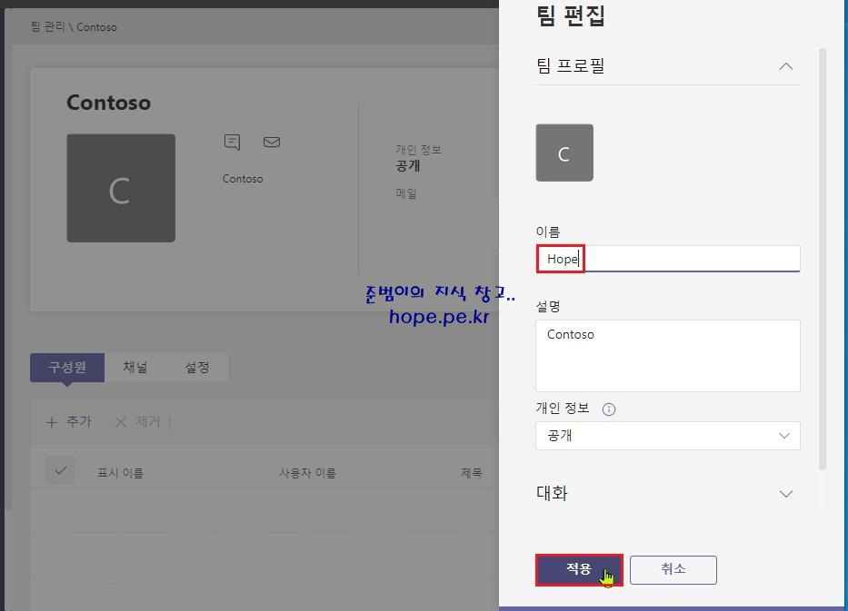 팀 편집 화면에서, '변경을 원하는 팀 이름 입력' 후 '적용' 을 클릭 합니다.