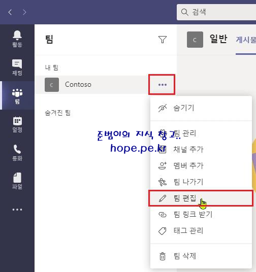 이름 변경을 하고자 하는 팀의 '기타 옵션' 클릭 후 '팀 편집' 을 클릭 합니다.