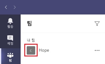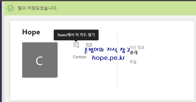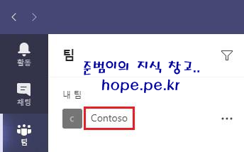 팀 사진은 팀 이름의 이니셜을 따라 자동으로 만들어집니다. 원래 팀 이름이 'Contoso' 였고, 팀 사진이 'C' 로 자동으로 만들어졌습니다.