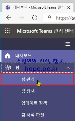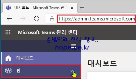Microsoft Teams 관리 센터 (https://admin.microsoft.com) 접속 후 '팀' 을 클릭 합니다.
