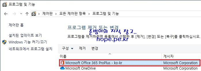 Cf) '제어판 - 모든 제어판 항목 - 프로그램 및 기능' 에서, 'Microsoft Office 365 ProPlus - ko-kr' 이 정상 설치 되었음을 확인 합니다.