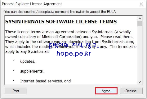Process Explorer License Agreemnet 창에서, 'Agree' 를 클릭 합니다.