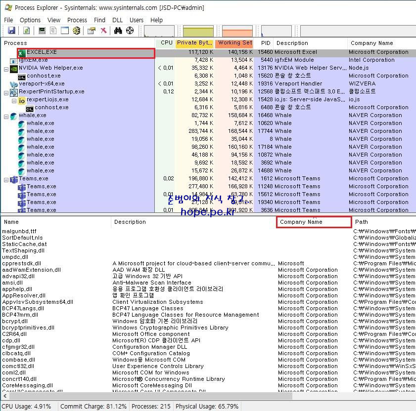 Process Explorer 를 이용하여 특정 프로세스가 타사 프로그램의 영향을 받는지 확인하는 과정에 대해 설명 드리겠습니다.
