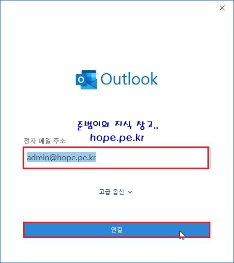 Outlook 창에서, '메일 주소' 입력 후 '연결' 을 클릭 합니다.