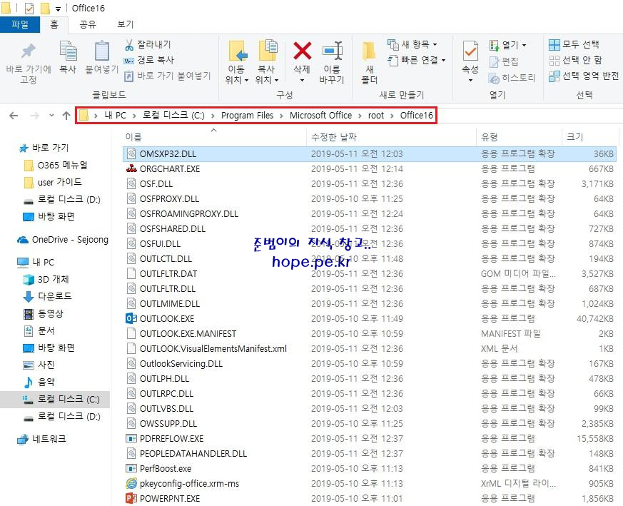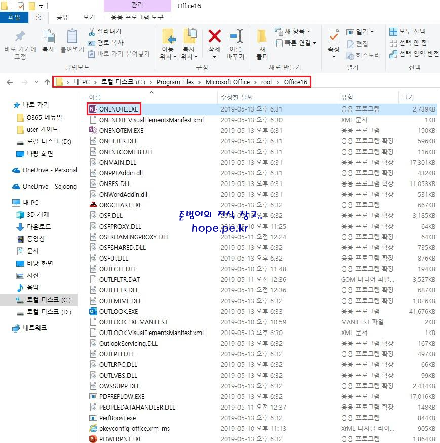 Cf) '파일 탐색기' 에서 Office 365 ProPlus 설치 경로인 'C:\Program Files\Microsoft Office\root\Office16' 를 확인해보면 OneNote 실행 파일이 존재함을 확인 할 수 있습니다.