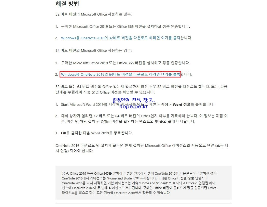 'Windows용 OneNote 2016의 64비트 버전을 다운로드 하려면 여기를 클릭' 을 클릭 합니다.