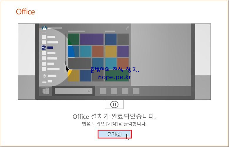 Office 설치가 완료되었습니다. 화면에서, '닫기' 를 클릭 합니다.