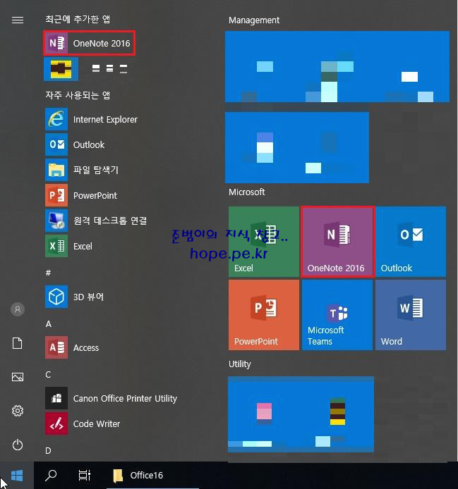 Cf) '파일 탐색기' 에서 Office 365 ProPlus 설치 경로인 'C:\Program Files\Microsoft Office\root\Office16' 를 확인해보면 OneNote 실행 파일이 존재함을 확인 할 수 있습니다.