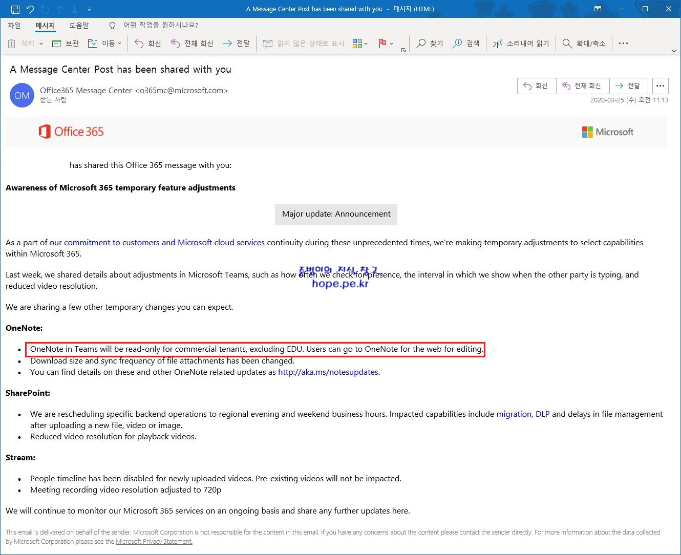 추가적으로 확인한 내용으로는 현재 코로나 여파로 Microsoft 365 사용량이 폭발적으로 증가하고 있어서 필수가 아닌 기능을 일시적으로 조정하고 있다고 합니다.
