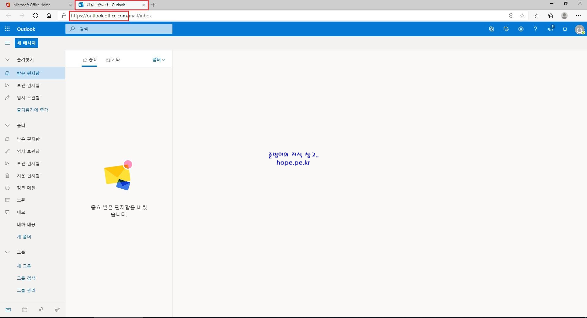 새 탭으로 'Outlook' 이 열리며, 'https://outlook.office.com' 사이트로 연결이 됩니다.
