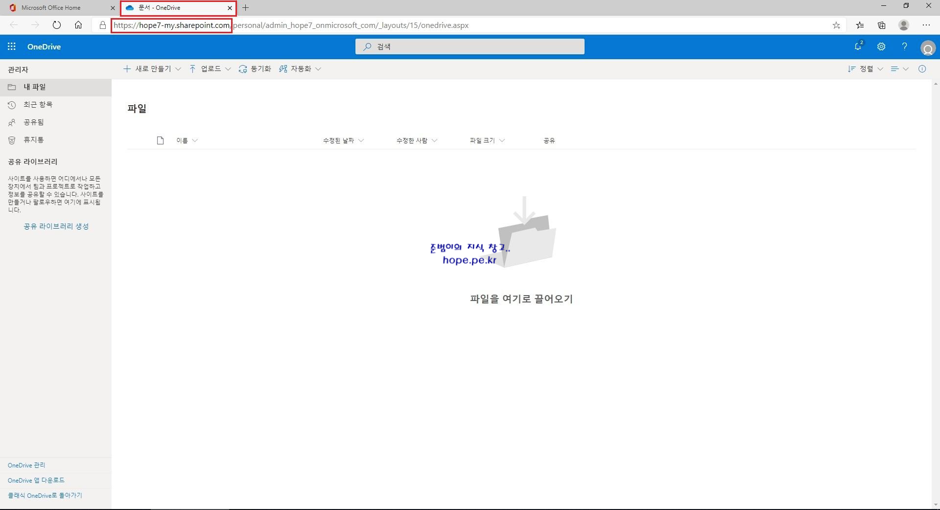 새 탭으로 'OneDrive' 가 열리며, 'https://tenant-my.sharepoint.com' 사이트로 연결이 됩니다.