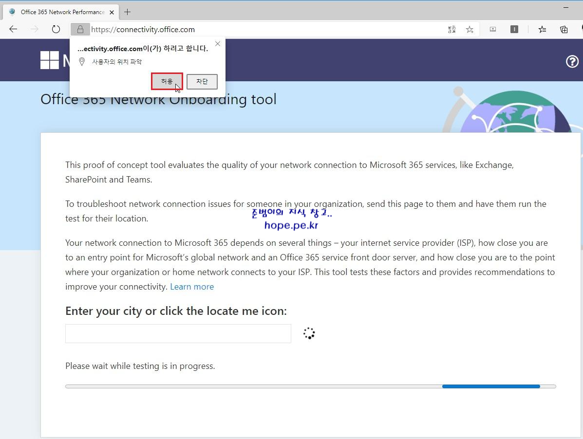 Office 365 Network Onboarding tool 사이트 (https://connectivity.office.com) 에 접속 후 '위치 버튼' 을 클릭 합니다.