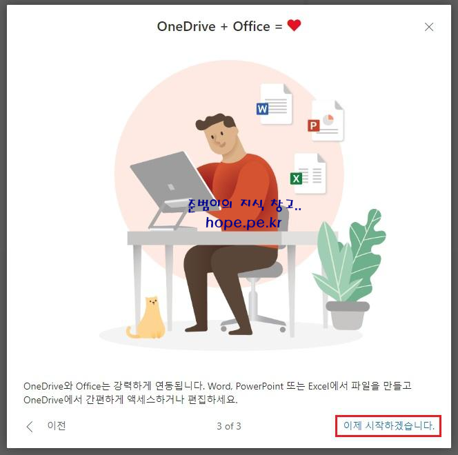 'OneDrive + Office = ♥' 팝업창에서 'OneDrive와 Office는 강력하게 연동됩니다. Word, PowerPoint 또는 Excel에서 파일을 만들고 OneDrive에서 간편하게 액세스하거나 편집하세요.' 메세지가 표시 됩니다. '이제 시작하겠습니다.' 를 클릭 합니다.