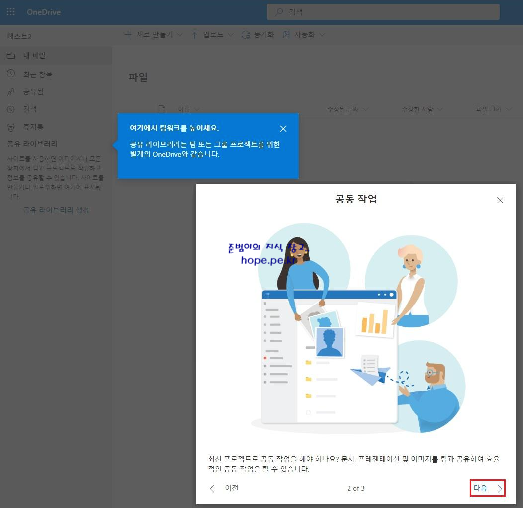 '공유 라이브러리: 여기에서 팀워크를 높이세요. - 공유 라이브러리는 팀 또는 그룹 프로젝트를 위한 별개의 OneDrive와 같습니다.' 메세지가 표시 됩니다. 그리고 '공동 작업' 팝업창에서 '최신 프로젝트로 공동 작업을 해야 하나요? 문서, 프레젠테이션 및 이미지를 팀과 공유하여 효율적인 공동 작업을 할 수 있습니다.' 메세지가 표시 됩니다. '다음 >' 을 클릭 합니다.