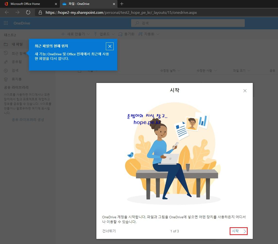 OneDrive 서비스가 새창으로 실행되며, '최근 항목: 최근 파일의 현재 위치 - 새 기능: OneDrive 및 Office 전체에서 최근에 사용한 파일을 다시 엽니다.' 메세지가 표시 됩니다. 그리고 '시작' 팝업창 에서 'OneDrvie 계정을 시작합니다. 파일과 그림을 OneDrive에 넣으면 어떤 장치를 사용하든지 어디서나 이용할 수 있습니다.' 메세지가 표시 됩니다. '시작 >' 을 클릭 합니다.