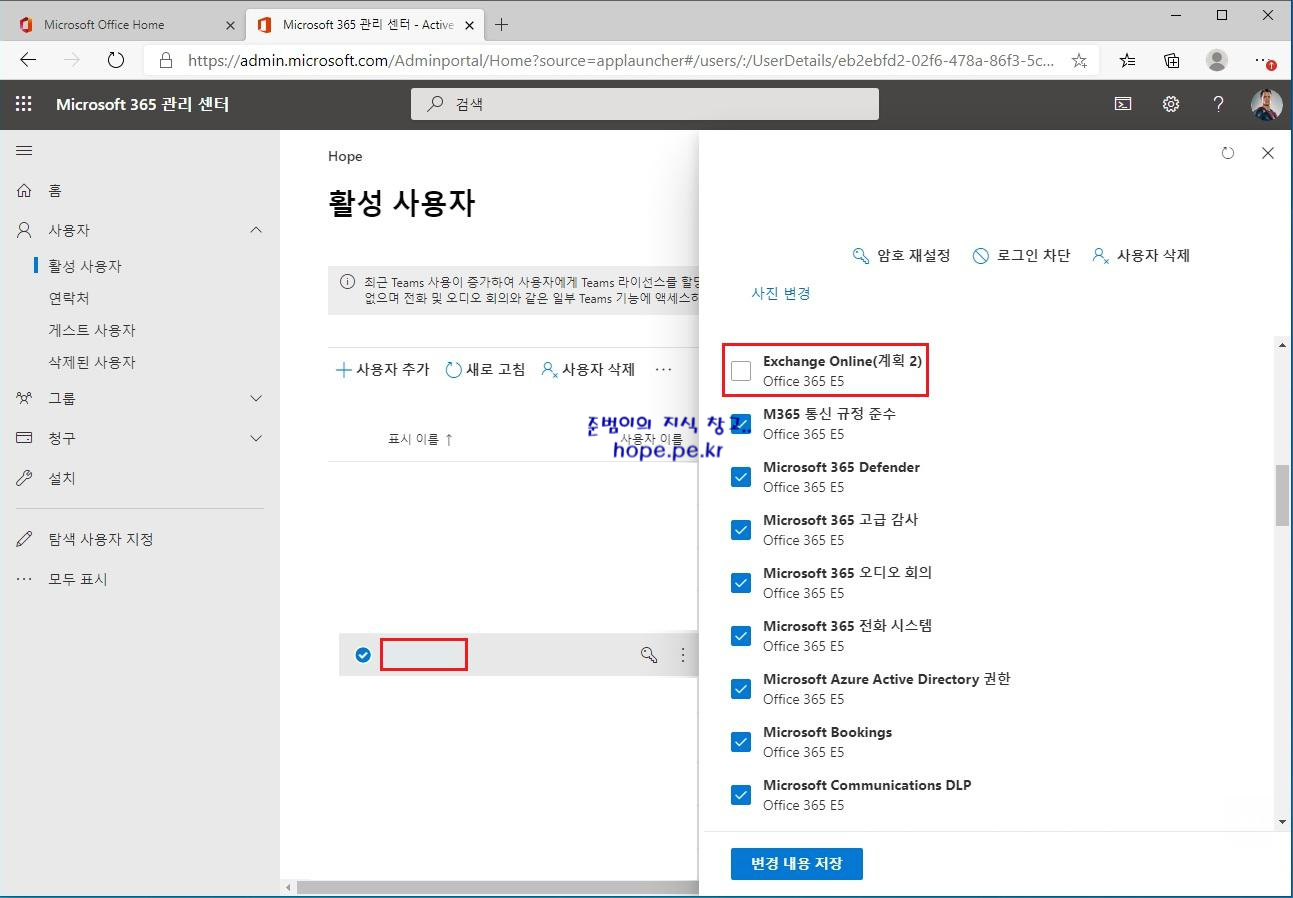 첫번째, 해당 사용자에 Exchange Online 라이선스가 없는 경우, 라이선스를 할당 합니다.
