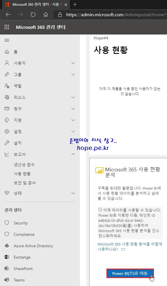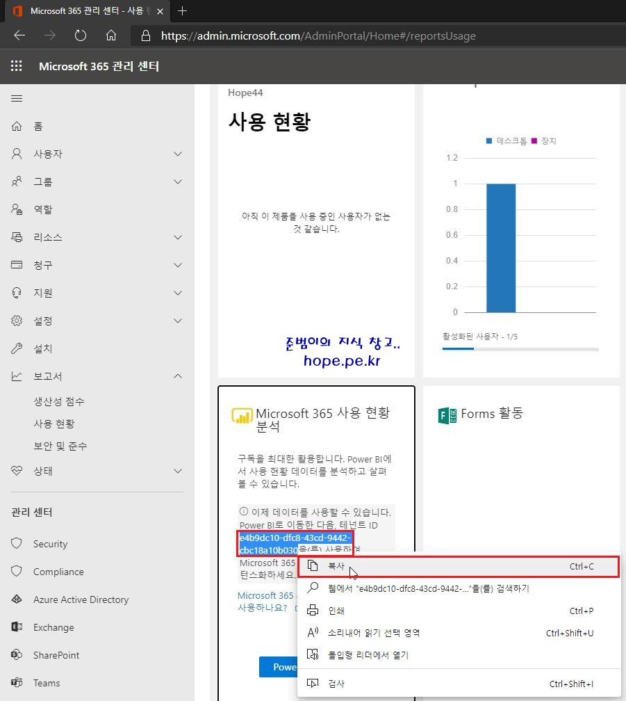 'Microsoft 365 관리 센터 - 보고서 - 사용 현황 페이지의 테넌트 ID' 를 '복사' 합니다.