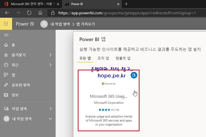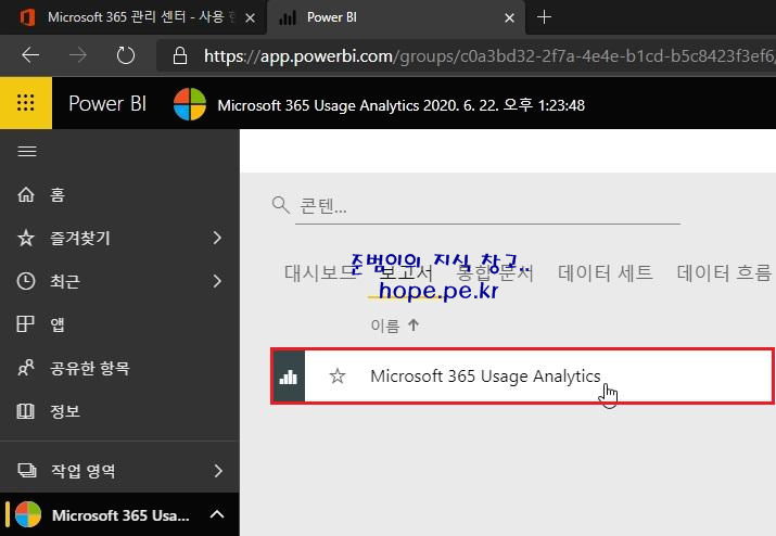 Power BI 앱 화면에서, 'Microsoft 365 Usage Analytics' 를 클릭 합니다.