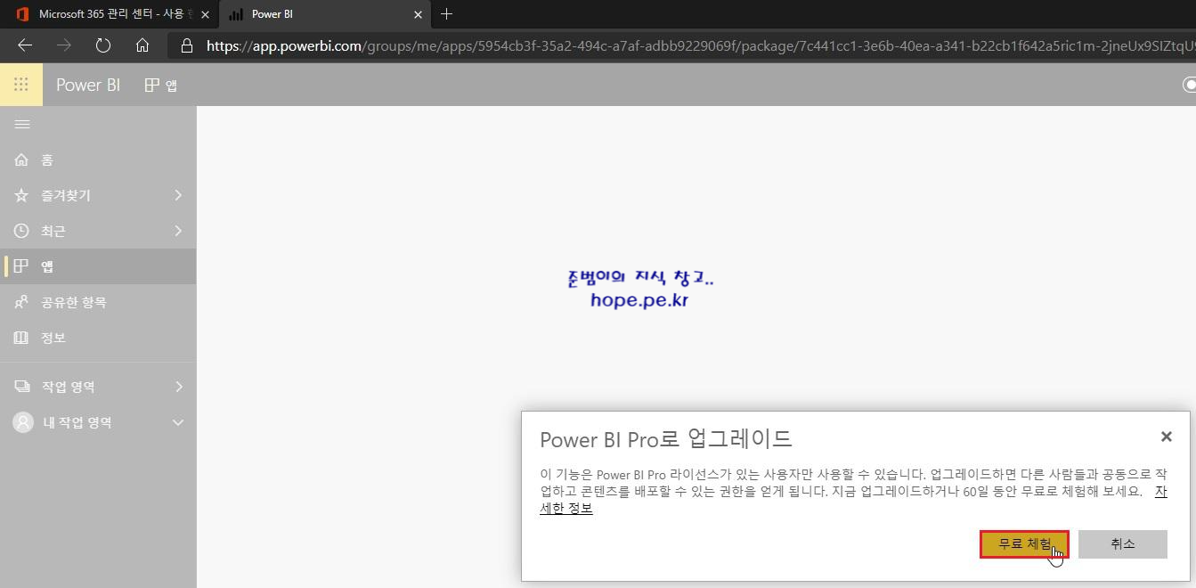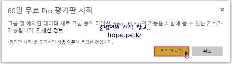 Power BI Pro로 업그레이드 화면에서, '무료 체험' 을 클릭 합니다.