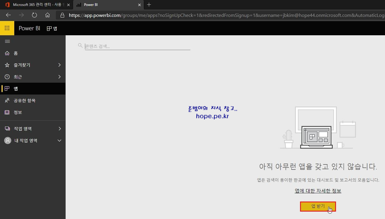 Power BI 페이지 에서, '앱' 을 클릭 합니다.