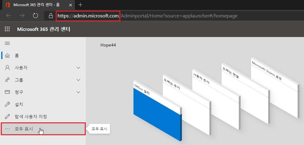 Microsoft 365 관리 센터 (https://admin.microsoft.com) 에 접속 후 '모두 표시' 를 클릭 합니다.