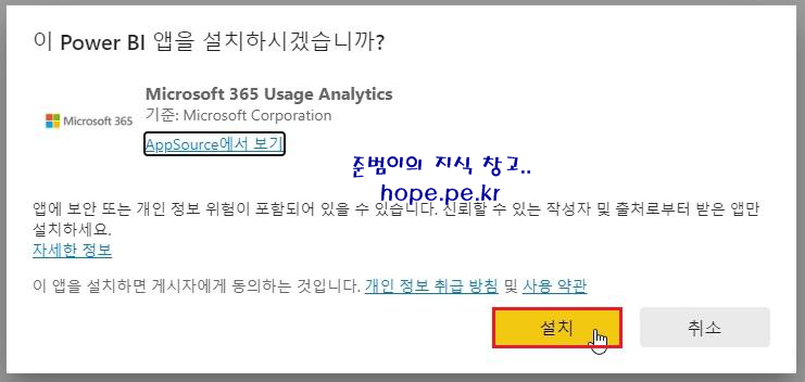 이 Power BI 앱을 설치하시겠습니까? 화면에서, '설치' 를 클릭 합니다.