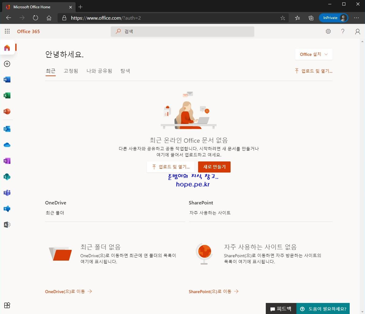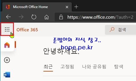 Office 365 앱 목록들이 좌측으로 이동되면서 예전에 비해 화면 중앙에서 문서를 사용할 수 있는 공간이 넓어졌습니다.