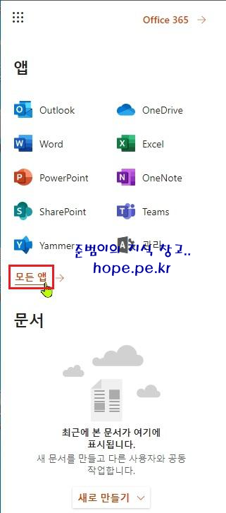 Cf) 기본 앱이 고정 되있으며, '모든 앱' 에서는 본인 구독에서 사용할 수 있는 앱 목록들을 확인할 수 있습니다. 그리고 '문서' 에서는 최근 사용한 문서를 바로 확인할 수도 있고, 문서도 새로 만들수 있습니다.