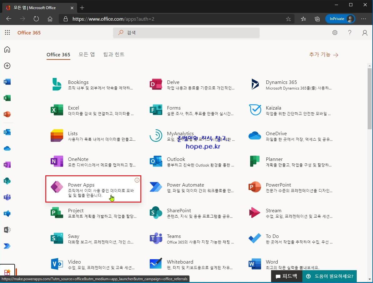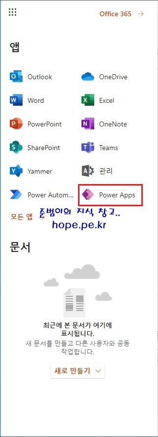 Office 365 모든 앱 화면에서, 'Power Apps' 를 클릭 합니다.