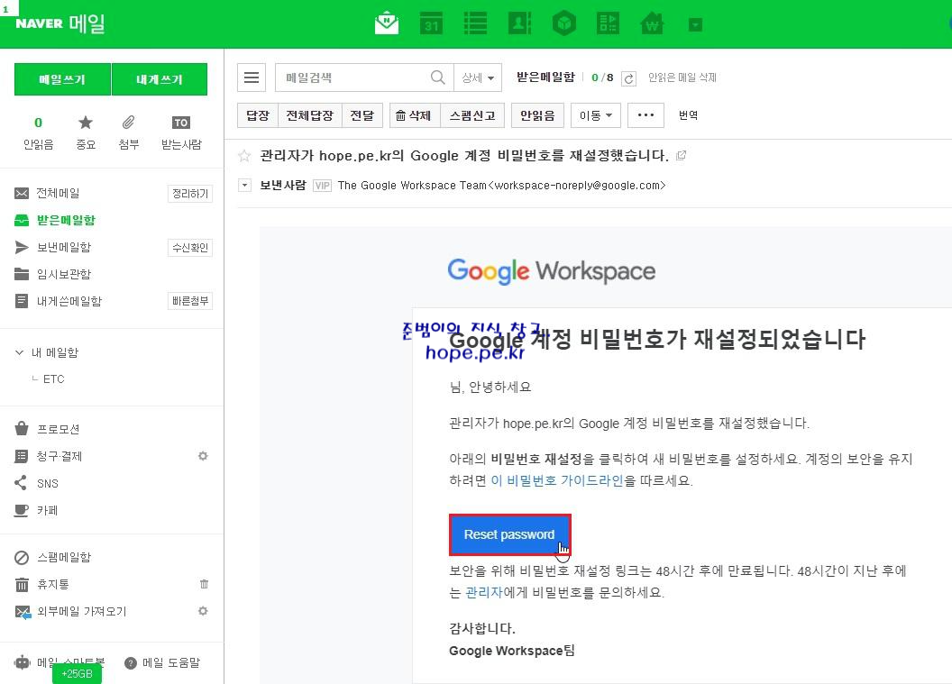 사용자의 외부 이메일에서 패스워드 초기화를 진행 합니다.