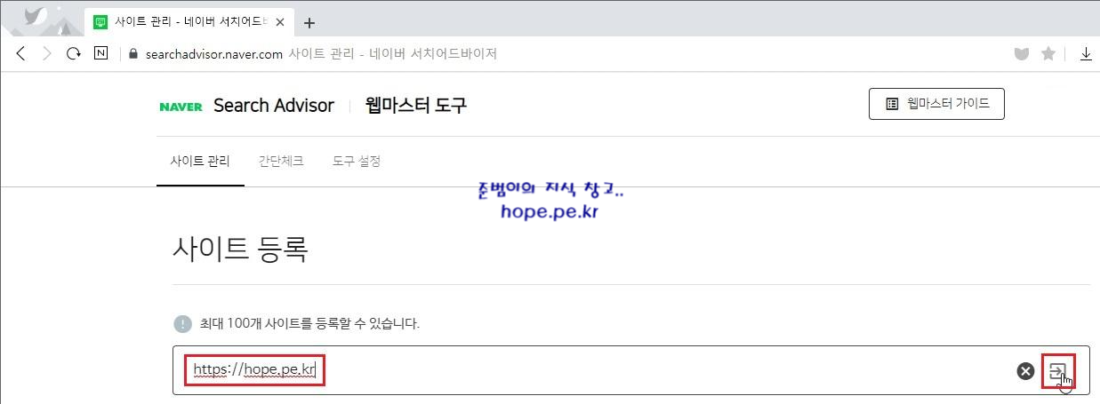 사이트 등록 화면에서, '티스토리 블로그 주소' 입력 후 '추가버튼' 을 클릭 합니다.