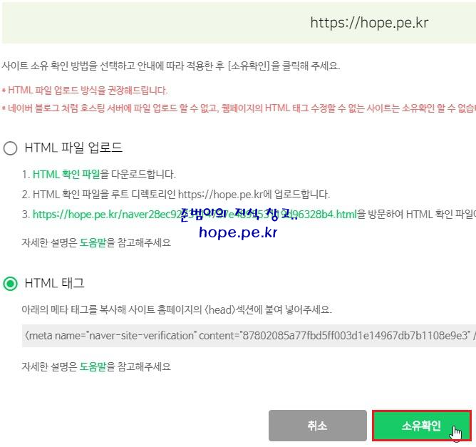 사이트 소유확인 화면에서, 'HTML 태그' 선택 후 메타 태그를 '복사' 합니다.