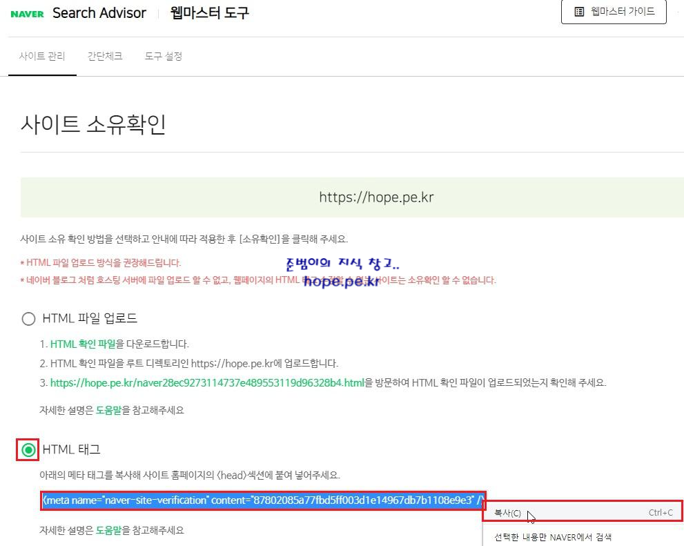 사이트 소유확인 화면에서, 'HTML 태그' 선택 후 메타 태그를 '복사' 합니다.
