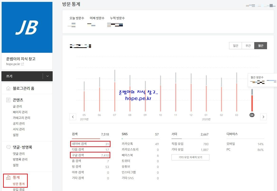 티스토리 블로그의 경우 아래 스샷과 같이, 네이버 검색을 통한 블로그 유입은 몇건 되지 않고 대부분이 구글 검색을 통한 유입 입니다.