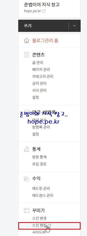티스토리 블로그 관리 홈 사이트(https://OOOOO.tistory.com/manage)로 이동 후 '꾸미기 > 스킨 편집' 을 클릭 합니다.
